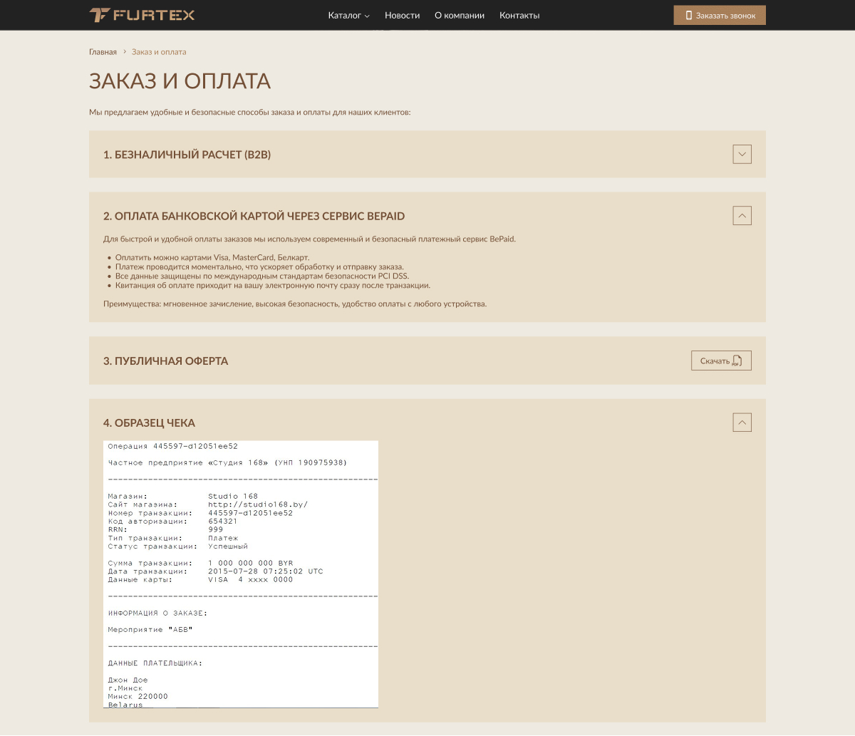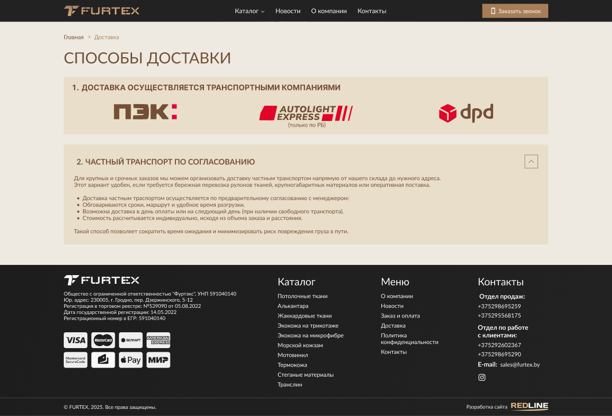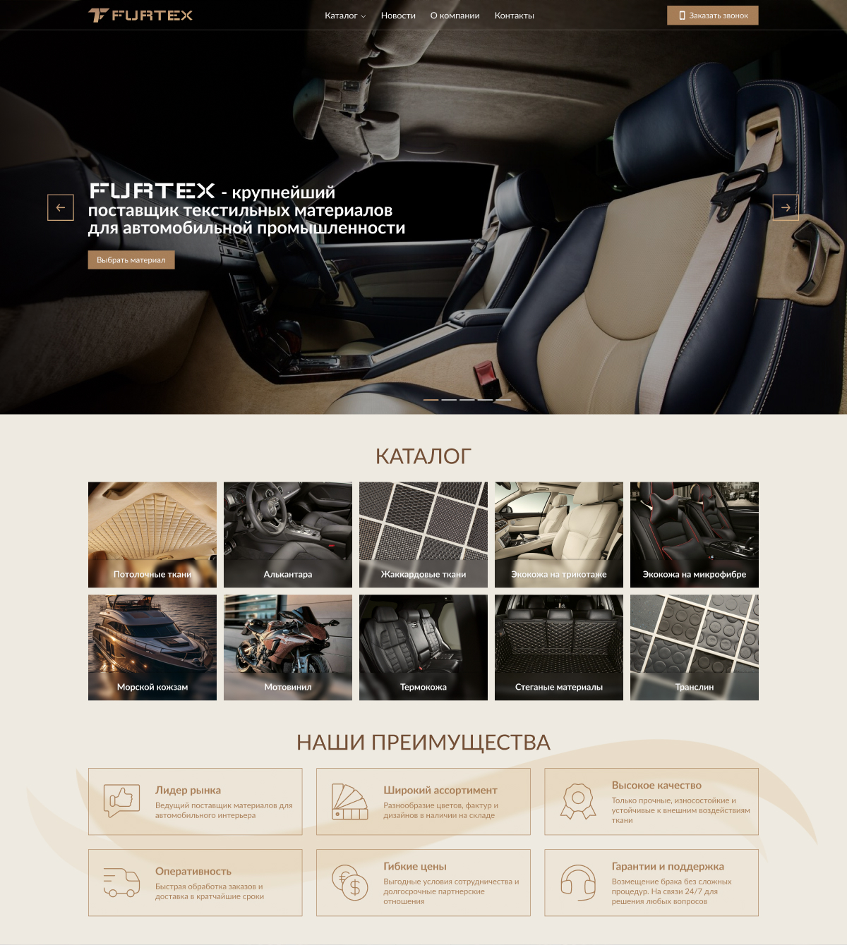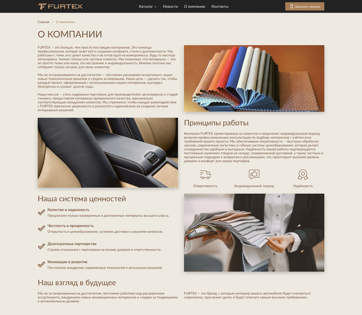 Главная страница выполнена в бежевых и коричневых оттенках нового логотипа, разработанного нашей студией. Цветовая гамма ассоциируется с фактурами кожи и текстильных материалов, формируя визуальную связь со сферой деятельности компании. В основе дизайна — крупные наглядные фотографии, акцентирующие внимание на текстурах и качестве продукции.