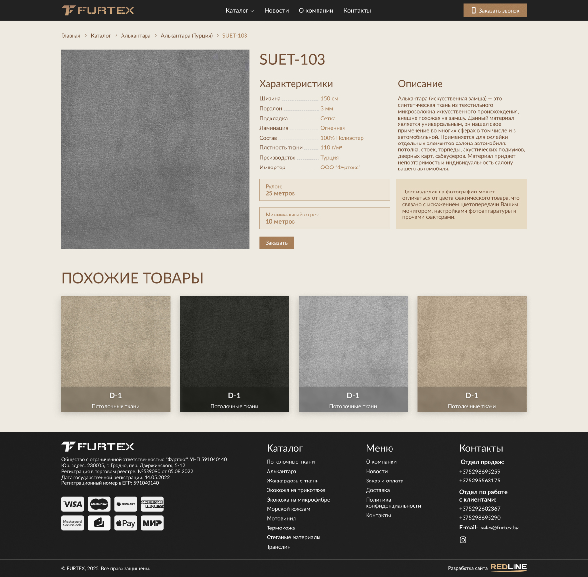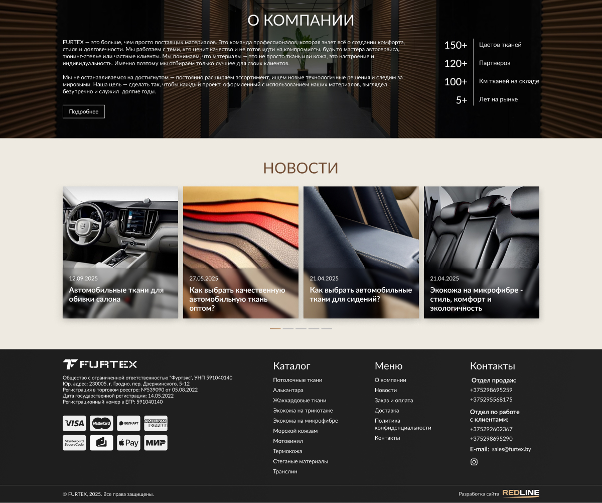 Furtex.by — крупный поставщик текстильных материалов оптом для автомобильной промышленности и реставрации салонов. Компания специализируется на высококачественных тканях и искусственных материалах (экокожа, алькантара, велюр, морской кожзам и др.) для обивки авто, микроавтобусов, яхт и мотоциклов. Сайт представляет ассортимент продукции и предоставляет удобный каталог материалов для клиентов и партнеров.