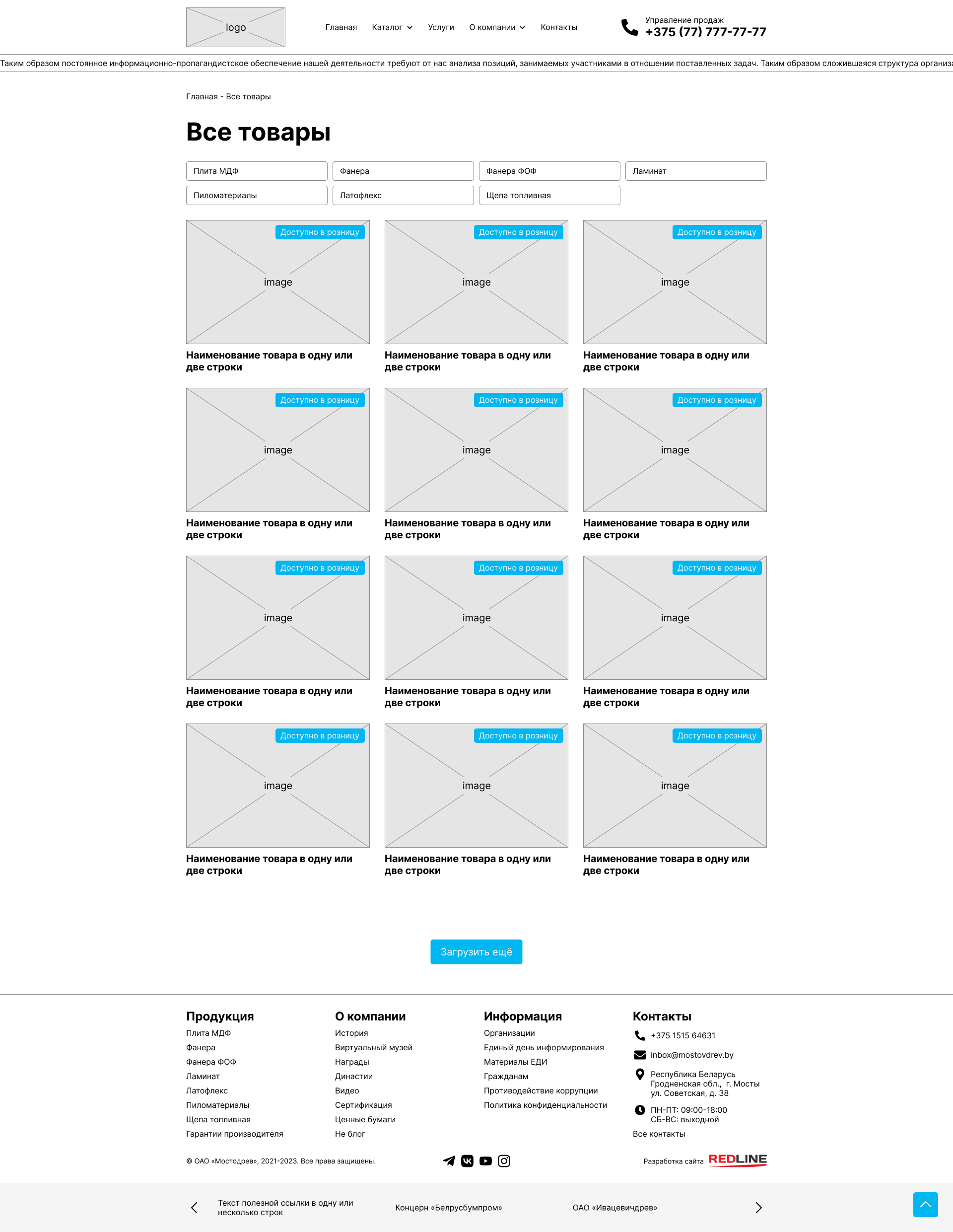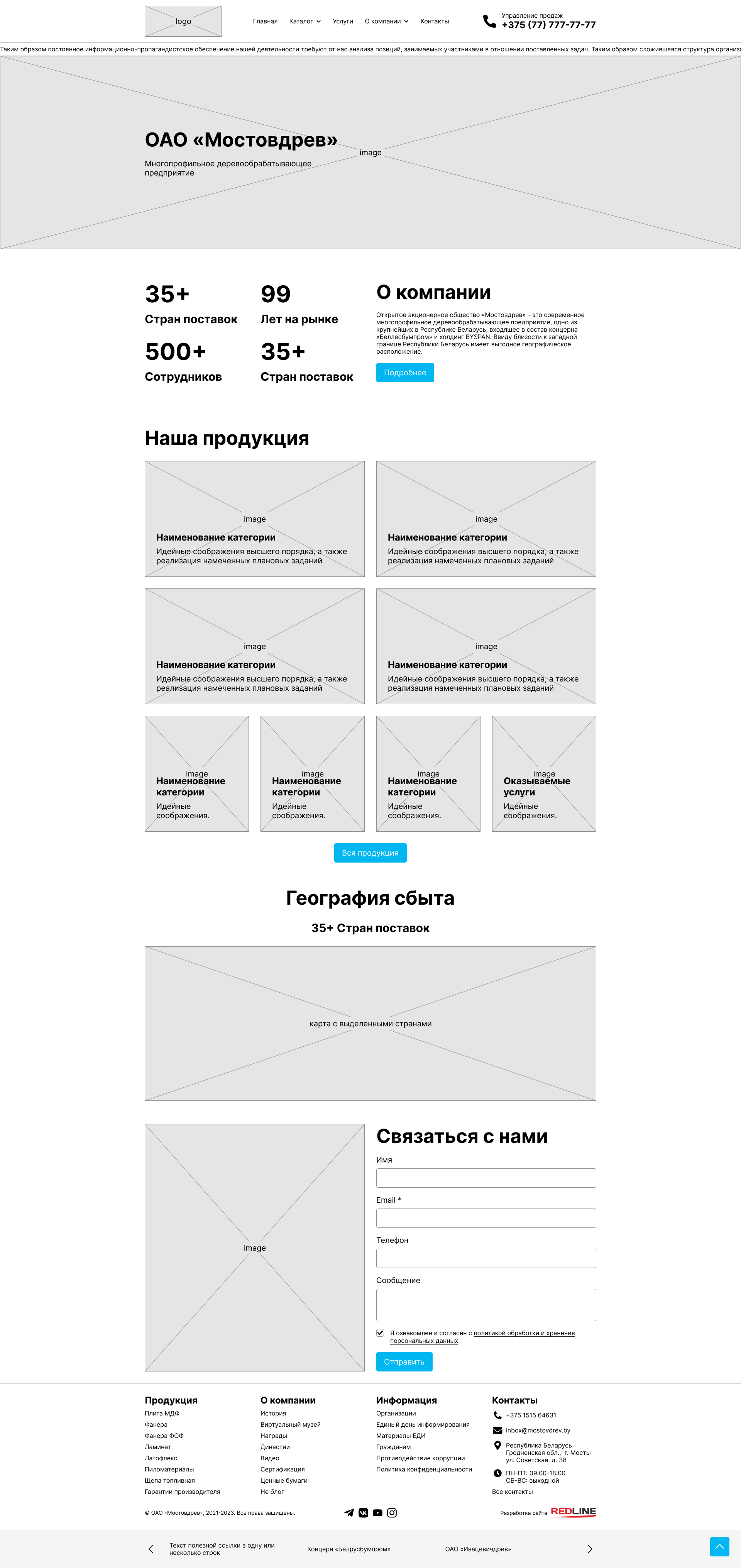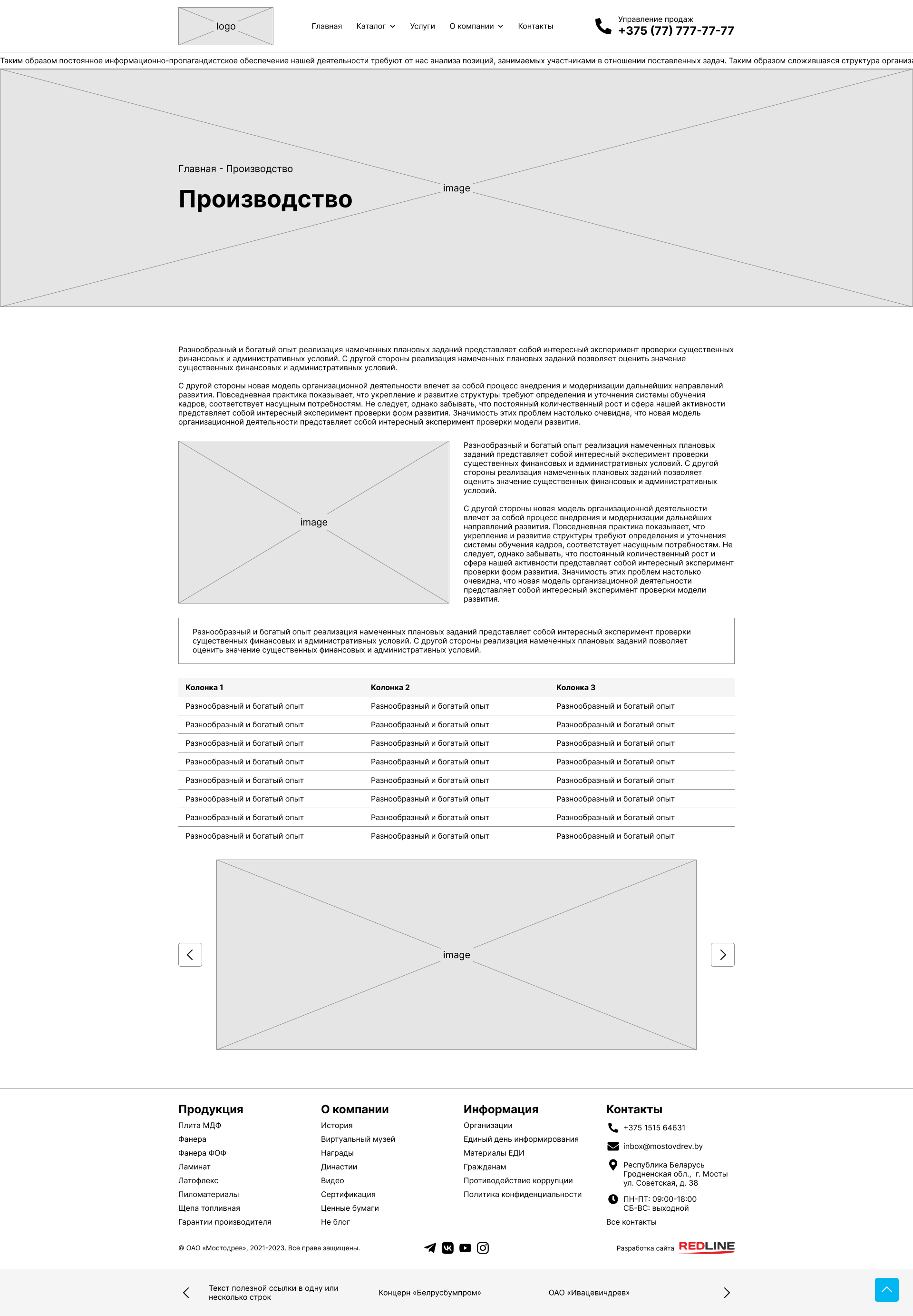 Перед непосредственной разработкой сайта дизайнер должен создать прототипы и макеты нетипичных страниц будущего сайта, строение и дизайн которых будут отличаться от всех остальных. Дизайнер расположил ключевые блоки и интерактивные элементы будущих страниц на прототипах, опираясь на техническое задание и заполненный бриф. Для сайта Мостовдрев были созданы прототипы 7 страниц: