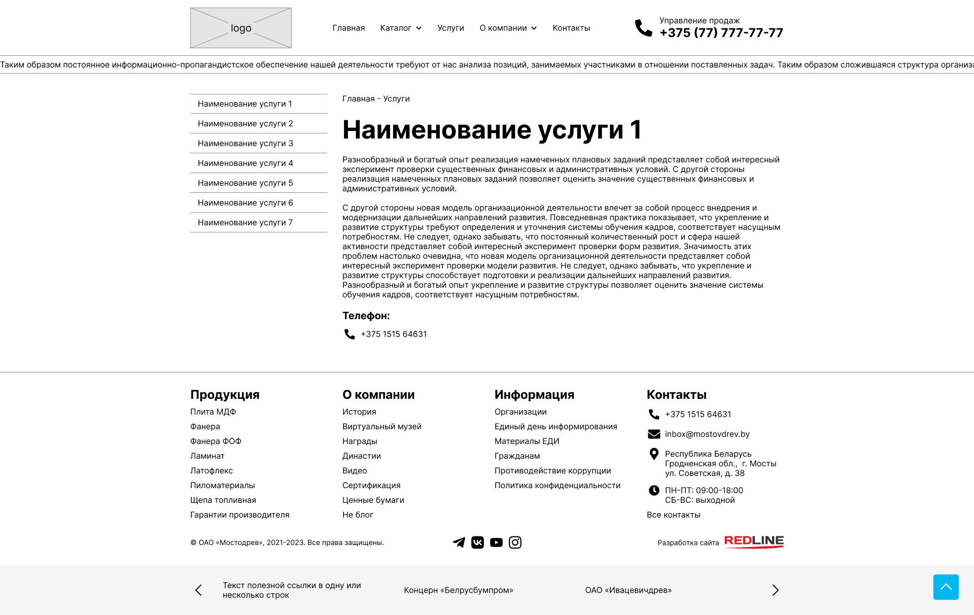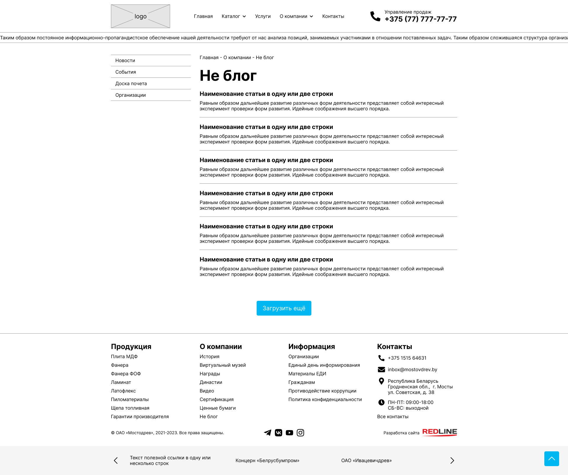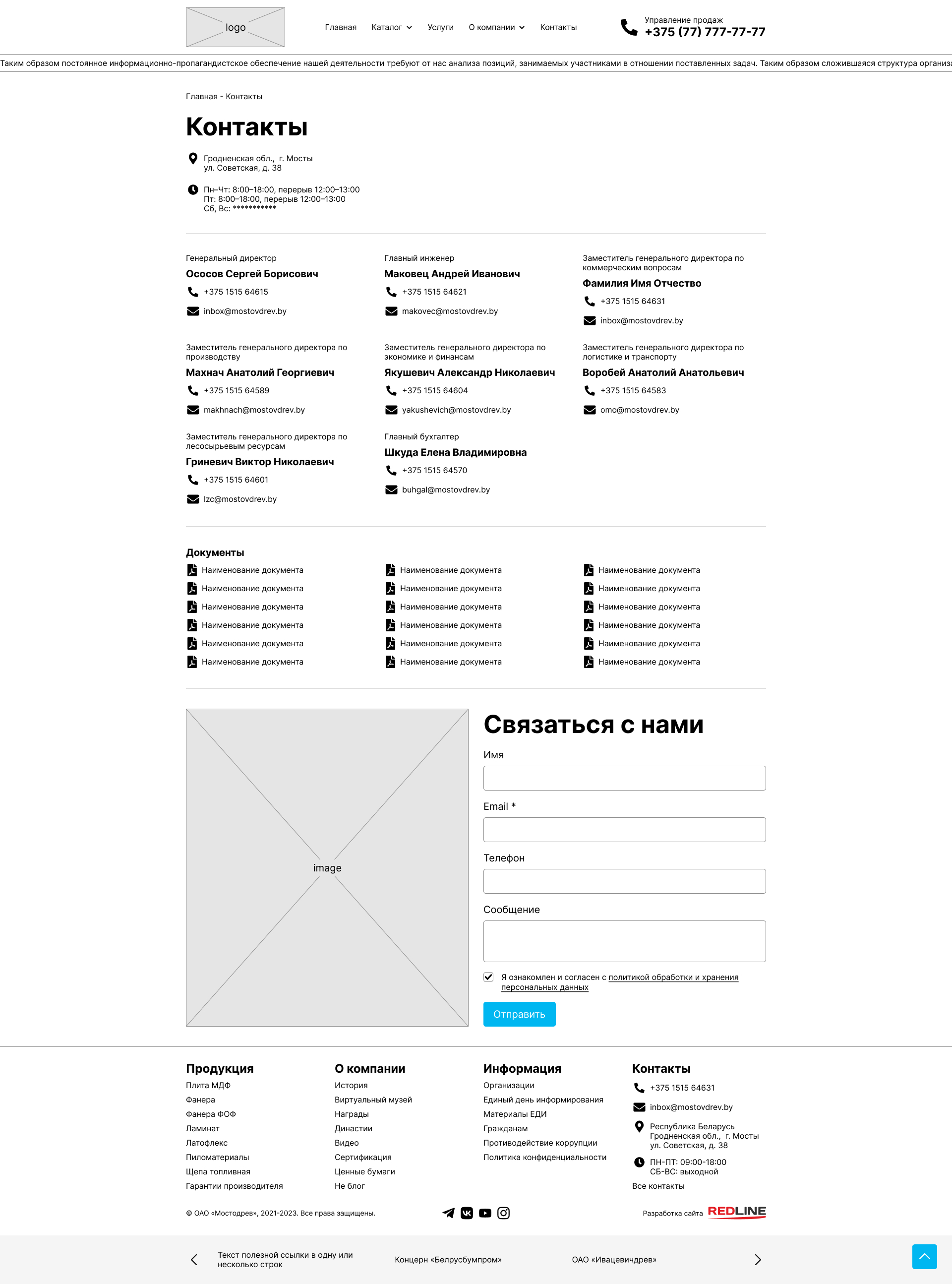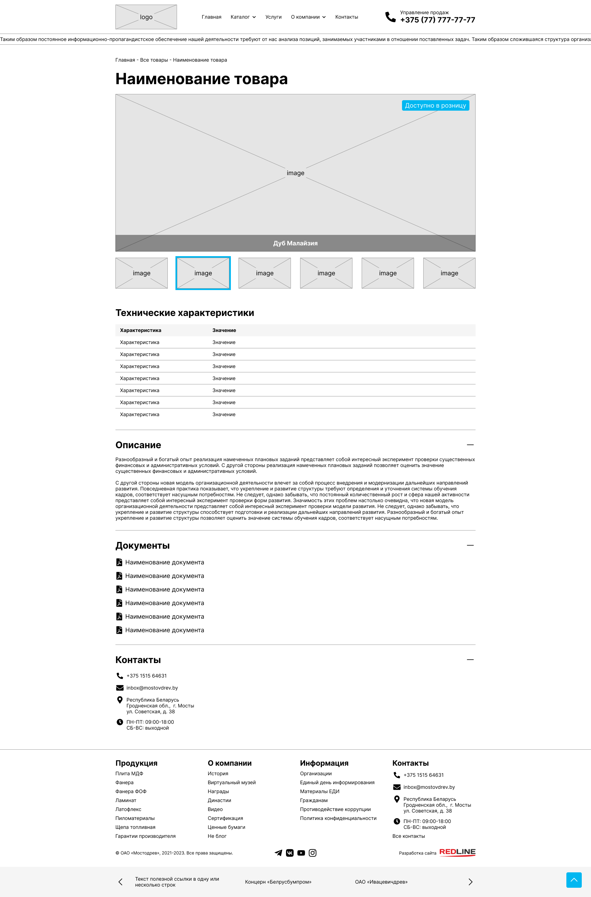 Перед непосредственной разработкой сайта дизайнер должен создать прототипы и макеты нетипичных страниц будущего сайта, строение и дизайн которых будут отличаться от всех остальных. Дизайнер расположил ключевые блоки и интерактивные элементы будущих страниц на прототипах, опираясь на техническое задание и заполненный бриф. Для сайта Мостовдрев были созданы прототипы 7 страниц: