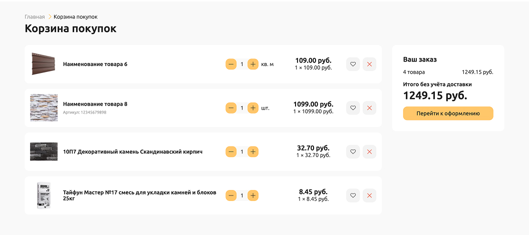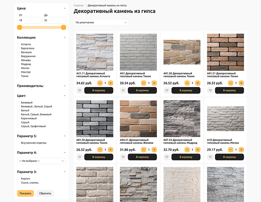 Разработать удобный и функциональный интернет-магазин для продажи строительных и отделочных материалов с разными шаблонами карточек товаров и интеграция с 1С.
