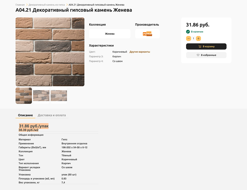 Страница товара включает фотографии товара, демонстрирующее его внешний вид и детали, информирует о наличии на складе, показывает основные характеристики и особенности материала, коллекцию, производителя, имеет кнопки для добавления товара в список покупок и для сохранения товара в списке избранных для последующего просмотра и покупки. А также подробное описание свойств и применения материала, информацию с условиями доставки и оплаты.