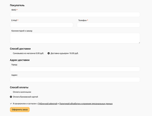 Оформление заказа происходит путем заполнения формы с полями для ввода данных о покупателе и способах связи. В ней также предлагается выбор способа доставки и оплаты, что делает процесс оформления заказа быстрым и удобным для клиента. Простой и понятный процесс оформления заказа снижает количество отказов на финальном этапе покупки.